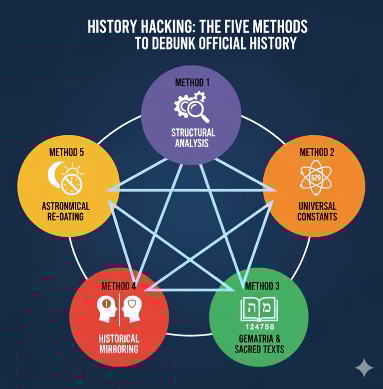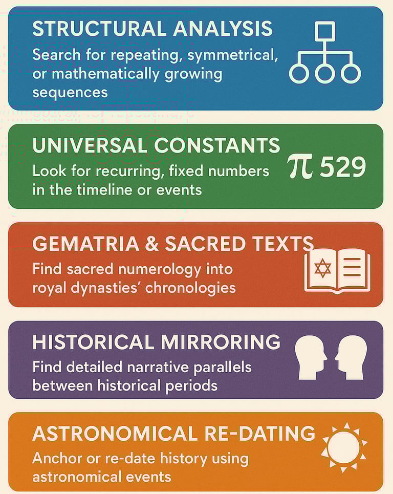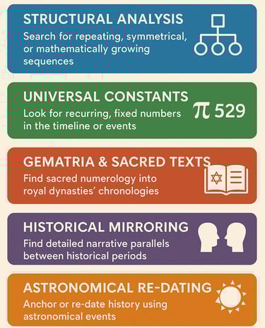 This article outlines five key analytical methods. It describes how to uncover hidden algorithms (Structural Analysis), find linking numerical constants (Universal Constants), decode sacred text influences (Gematria & Sacred Texts), identify narrative duplicates (Historical Mirroring), and re-evaluate astronomical events (Astronomical Re-Dating).