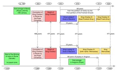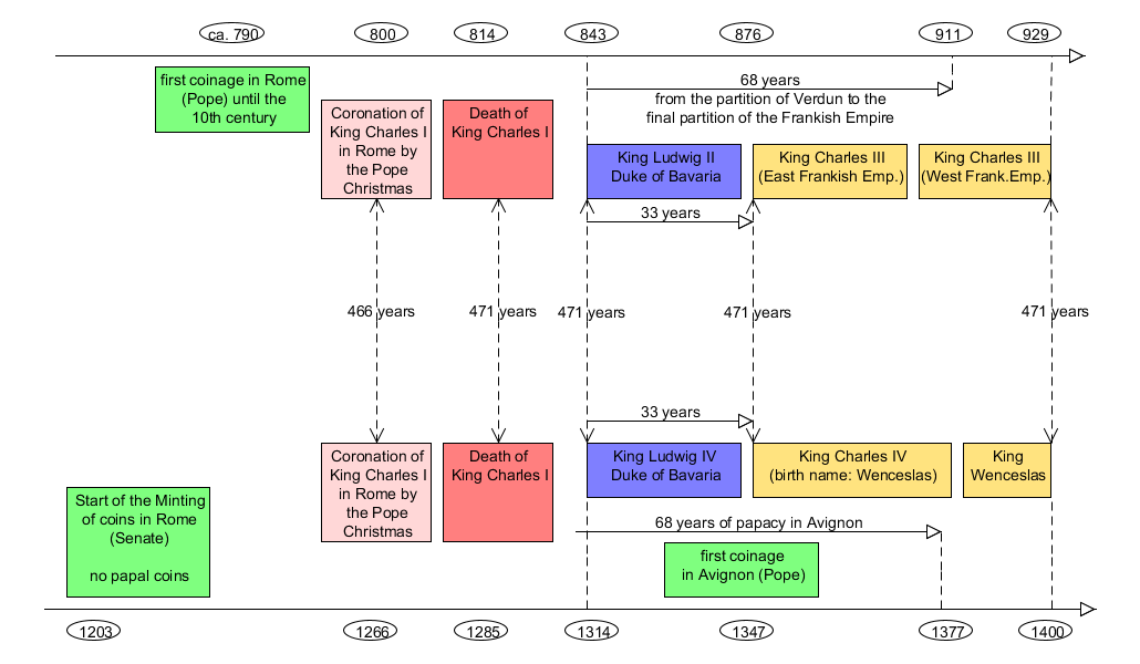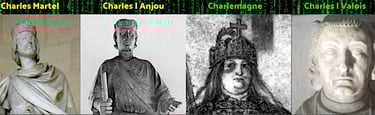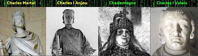 This article proves that the historical figure of Charlemagne is a fabrication, or a "phantom," constructed from the lives of two later French kings: Charles I of Anjou and Charles I of Valois. It presents several pieces of evidence: the 300-year gap where no major ruler was named Karl/Charles after the Carolingians; the parallel coronations and deaths of Charlemagne and Charles I of Anjou, separated by a consistent time gap; the physical resemblance of Charlemagne's coin effigy to Charles I of Valois's statue; and the mirroring of family names, where Charlemagne's father/son "Pippin" is presented as a short form of Charles I of Valois's father/son "Philipp."