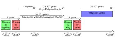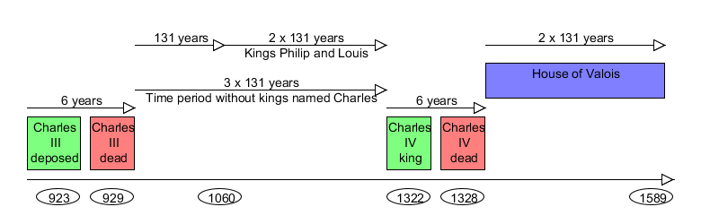 The structure becomes even more suspect when looking at the names of the kings themselves. In the 2 x 131-years span from 1060 to 1322, the French monarchy was dominated by just two names: Philip and Louis. According to the record, these two names ruled in a consistently alternating fashion.