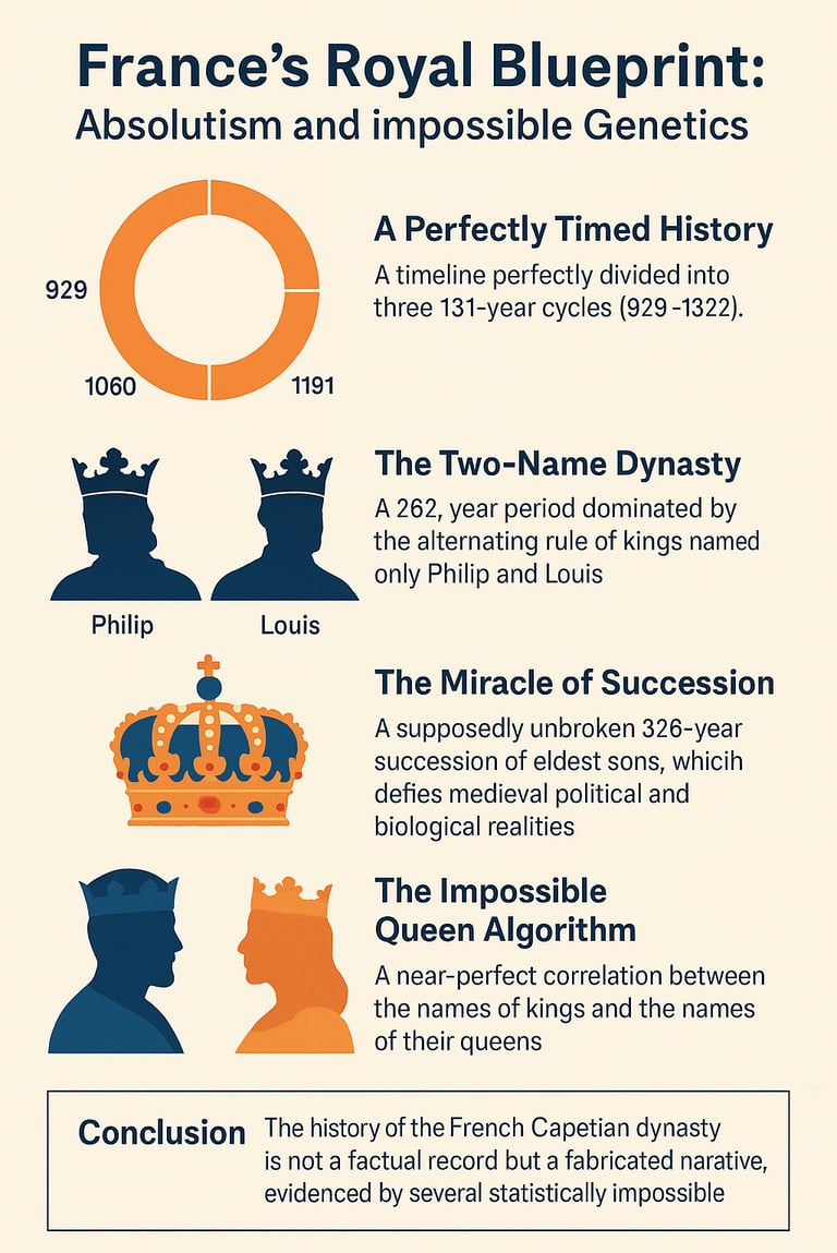 The history of the French Capetian dynasty is not a factual record but a fabricated narrative, evidenced by several statistically impossible patterns. The article highlights four main anomalies: 1) A timeline perfectly divided into three 131-year cycles (929-1322). 2) A 262-year period dominated by the alternating rule of kings named only Philip and Louis. 3) A supposedly unbroken 328-year succession of eldest sons, which defies medieval political and biological realities. 4) A near-perfect correlation between the names of kings and the names of their queens. These patterns, impossible to achieve by chance, suggest the French royal history was artificially constructed to create a "royal blueprint" of divinely ordained stability and legitimacy.