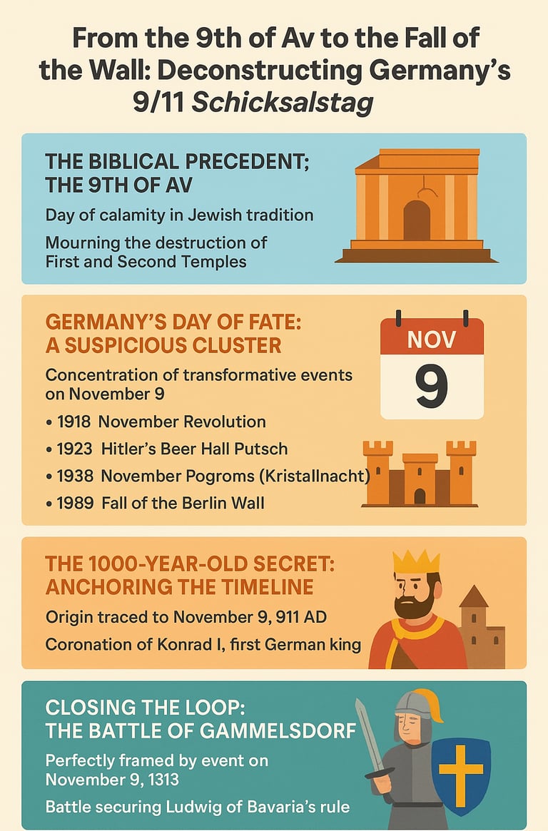Germany's "Schicksalstag" (Day of Fate) on November 9th is not a series of coincidences but a deliberately encoded historical pattern. This date (the 9th day of the 11th month) is connected to the Jewish day of mourning, the 9th of Av. The pattern's origin is traced back to November 9, 911 AD, with the coronation of Conrad I, the first German king. This event is presented as the starting point of an artificial 403-year historical block. The period is perfectly framed by another key event on the same date: the Battle of Gammelsdorf on November 9, 1313, which secured Louis of Bavaria's rule. This symmetry suggests that German history was constructed around this fateful "9/11" date.